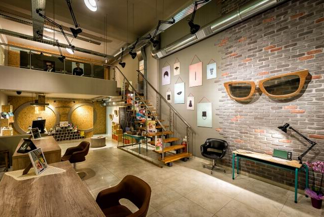 室內(nèi)的兒童區(qū)也加上了黑板,整個空間的裝飾元素大多都以眼鏡的造型而設計,是不是感覺這樣的眼鏡店很獨特呢?
