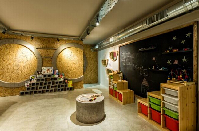 整個室內(nèi)是模仿學校的教室。簡潔的樓梯,個性的裝飾,營造了一種輕松歡快的氛圍。